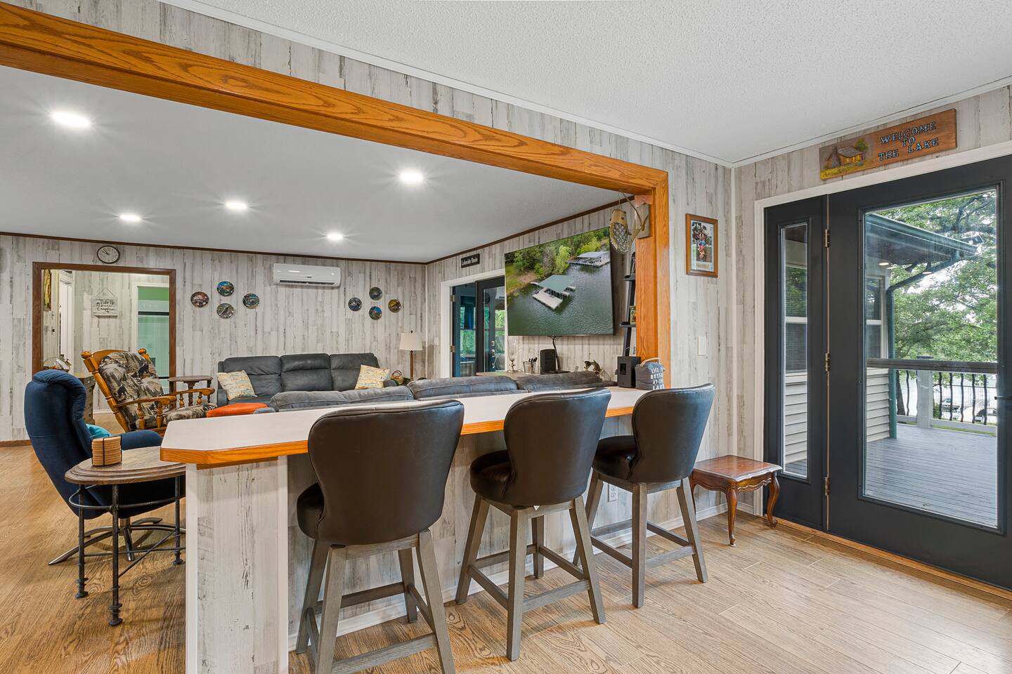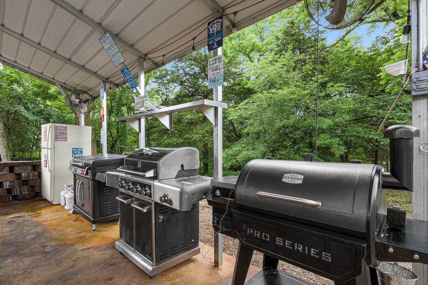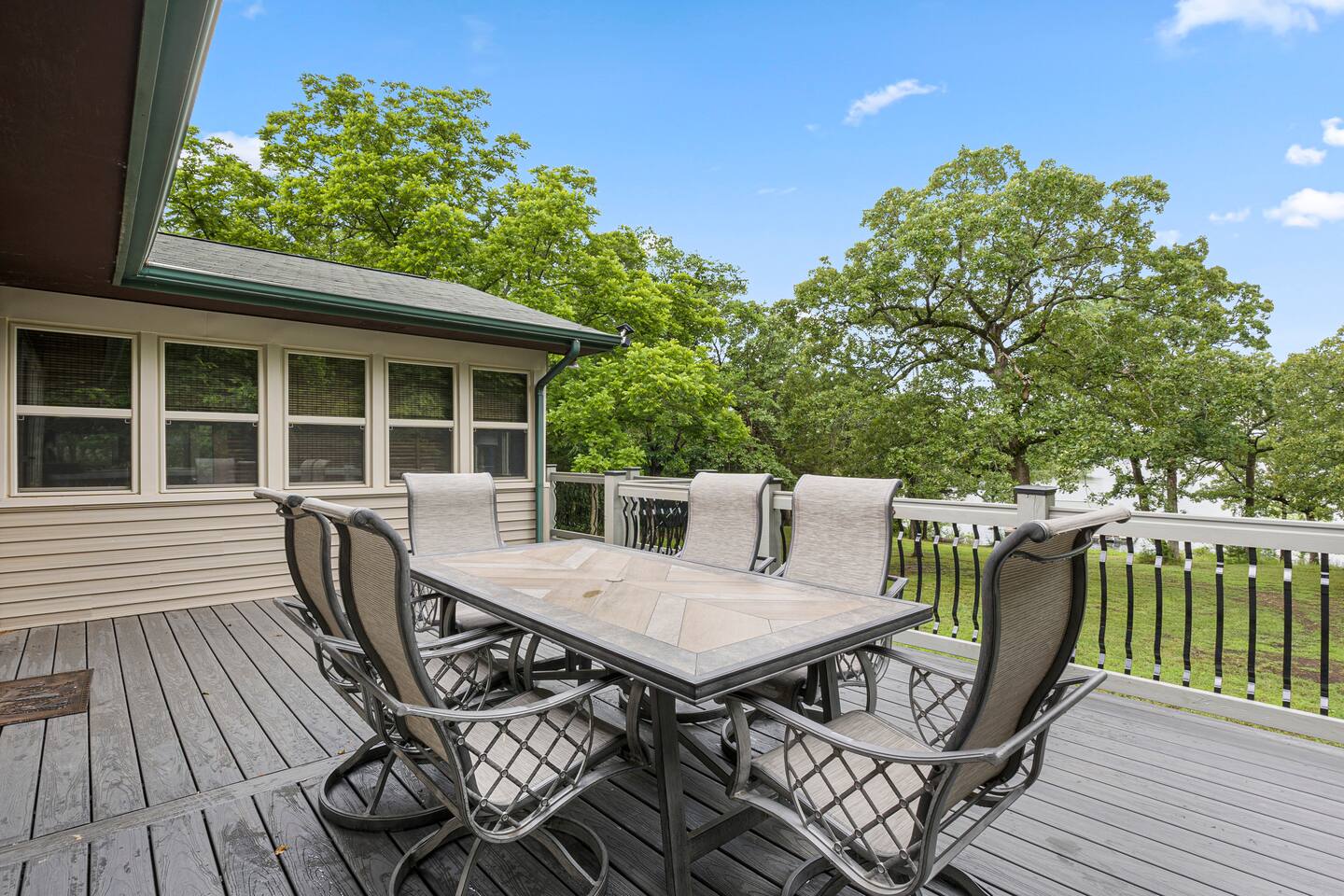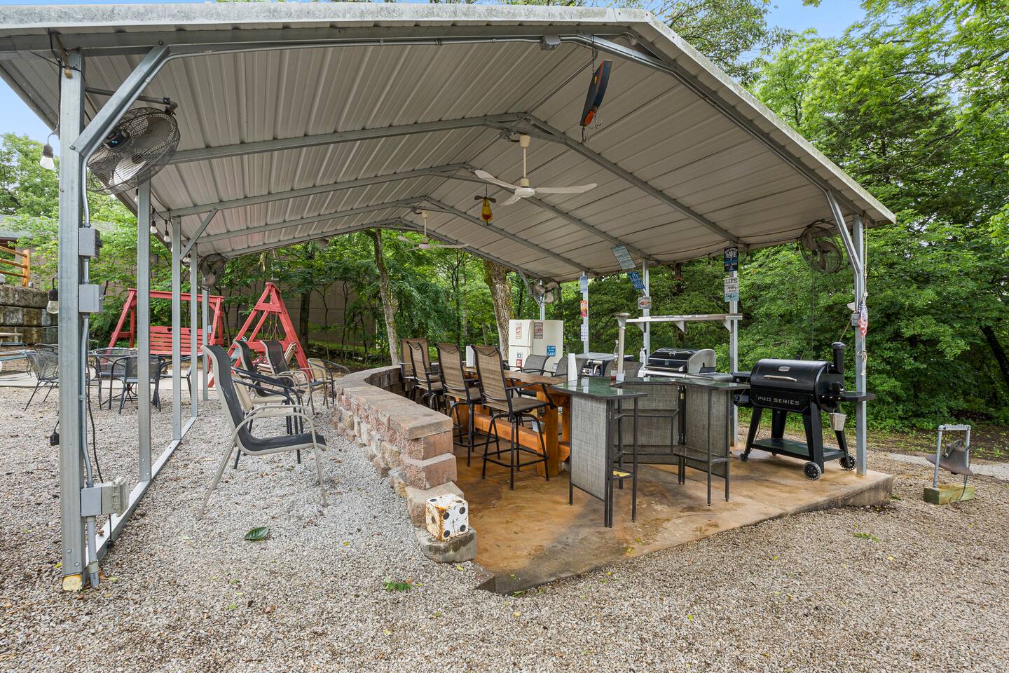 Welcome to our lake home! Our home sits right on the point with a stunning view of Table Rock Lake. There are new furnishing throughout, a TV in the family room and one in each bedroom. Three bedrooms have king beds, the 4th bedroom has a twin bed and a bunk bed with a full size on bottom and twin on top. There are two full bathrooms, one in the master bedroom and one in the hallway. The kitchen has all new appliances, an island with bar stools and is fully stocked along with basic seasonings like salt and pepper. There is also a big pantry around the corner from the kitchen with additional kitchen items and plenty of room for your food. The family room and living room are separated by a countertop that also has bar stools, for an entirely open concept. The outdoor cooking area Has ceiling fans, nighttime lighting, a refrigerator, gas BBQ grill, large gas griddle, pellet smoker and a double gas burner so you can cook to your hearts content all while overlooking the lake! It is covered, so you can still enjoy the outside when it’s raining. Then at night turn on the lights or spend time by the campfire/firepit. Both areas have additional seating. Private Dock A short walk down the gradual sloped hill (the last 15’ to 20’ becomes rocky) will take you to the private dock where you can fish, swim, sunbathe or use the kayaks located under the back deck. Other Things to Note: The house is located in a quiet neighborhood, has private parking and has gates that can be closed for more protection for your children or pets. The kitchen is fully stocked with flatware, cooking utensils, dishes, coffee mugs, microwave, coffee maker/keurig combo, toaster, pots, pans, crock pot, storage containers, serving platters/trays and basic spices. Both bathrooms have shower dispensers with shampoo, conditioner and body wash, all are full upon your arrival. We offer a starter supply of coffee pods, coffee, sugar/sweetener packets, paper towels, toilet paper, trash bags, hand soap, dish detergent, cleaning supplies and laundry detergent. We also provide starter firewood for the fire pit. We offer a variety of family games. We have Wi-Fi, Direct TV and smart HDTV’s so you can sign into your own streaming services. We are just 5 minutes from town where you will find: Harter House (grocery store), Dollar General Jug n' Plug (bait, tackle and liquor) Steak Inn Casa Maya Pizza Hut (Pizza Hut has its own dock, so you can go by boat if you want.) Kings River Marina Restaurant There are two marinas nearby: Campbell Point Marina Closer by Boat (10-15 minute drive) By Car (19 minute Drive) Boat Rentals Slip Rentals Equipment Rentals (Skiing, tubing, wakeboards, etc) Kings River Marina Closer by car (10 minute drive) By Boat (30 minutes to an hour drive "depending on type of boat") Boat Rentals Slip Rentals Has its own Restaurant if you want to bring your own boat, as we are not allowed to offer a boat slip in our dock as per the Army Corps of Engineers regulations. For family entertainment: Be sure to check out these top attractions! Branson is only a 45 minute drive Branson Landing is a 54 min drive Top of the Rock is a 35 minute drive Big Cedar Lodge is a 35 minute drive Thunder Ridge Arena is a 40 minute drive Pets are allowed with restrictions: *Preferably no more than 3 pets and must be housebroken. *They are NOT ALLOWED on furniture/beds. *You know your dog better than anyone, if they tend to scratch doors/chew do not leave them unattended. *When leaving the property, lock them up in the cage provided or bring your own. No parties. No smoking/vaping inside the home.